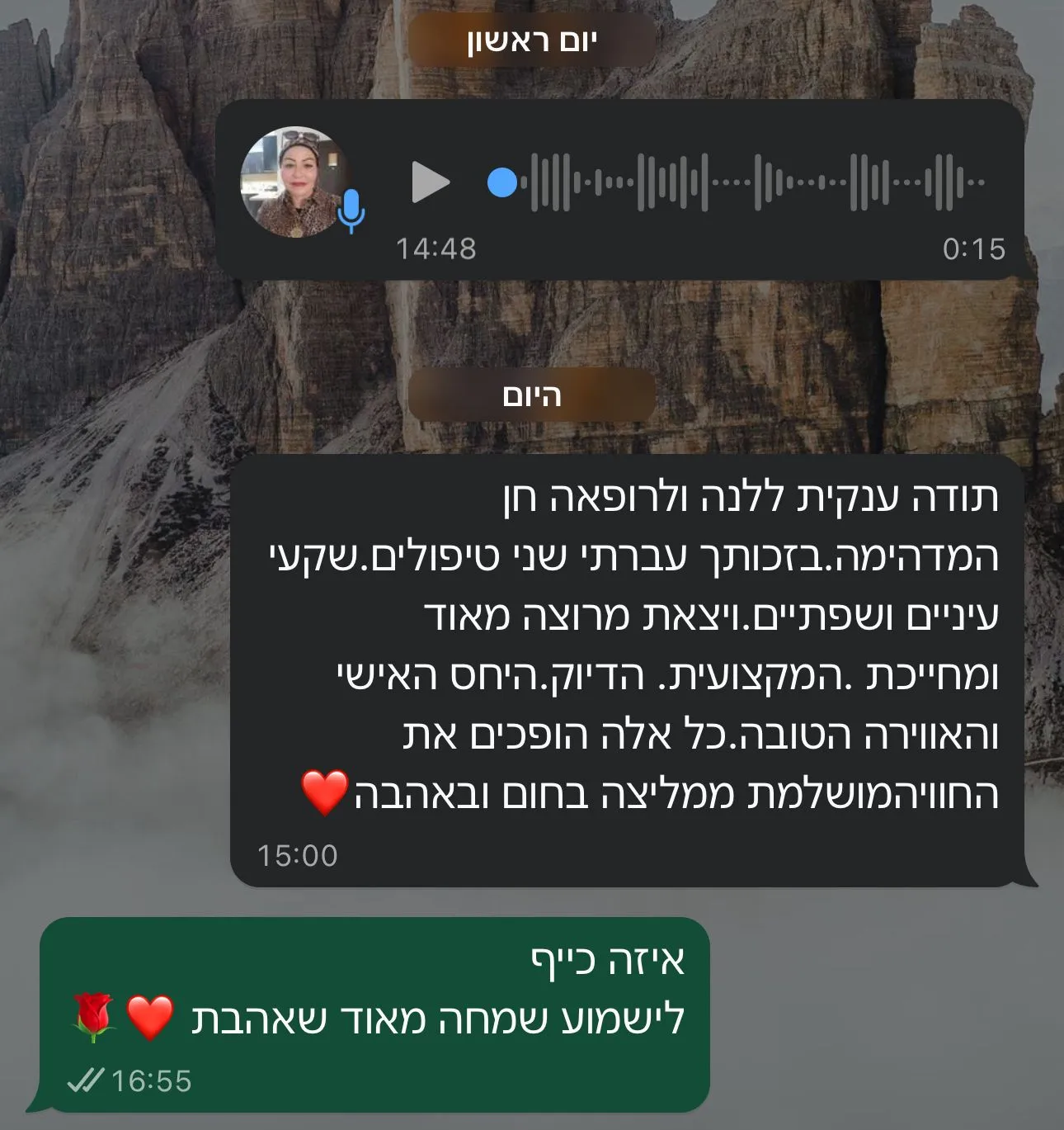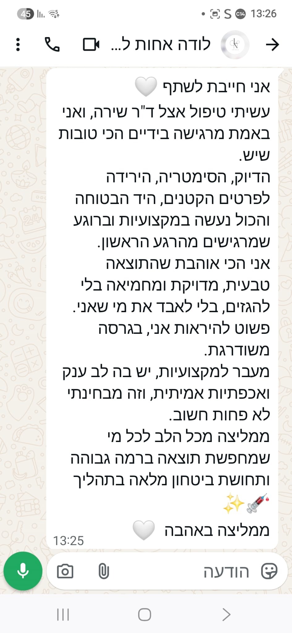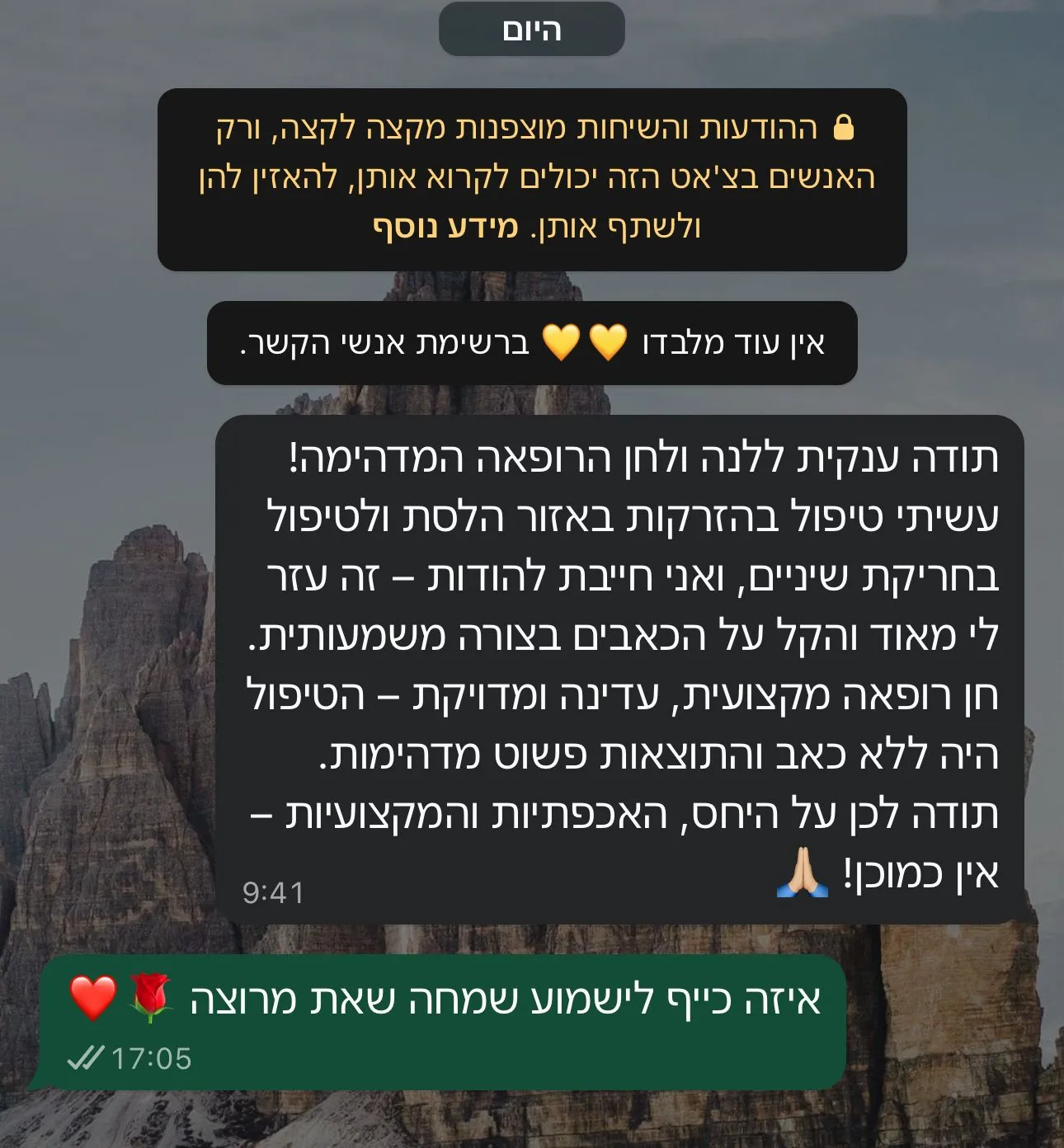מעקב וביטחון: במידה ומופיעה תגובה שאינה מוכרת לך או שנמשכת מעבר למצופה, הצוות המקצועי זמין עבורך לייעוץ טלפוני או פגישת ביקורת, כדי להבטיח החלמה תקינה ושקט נפשי מלא.