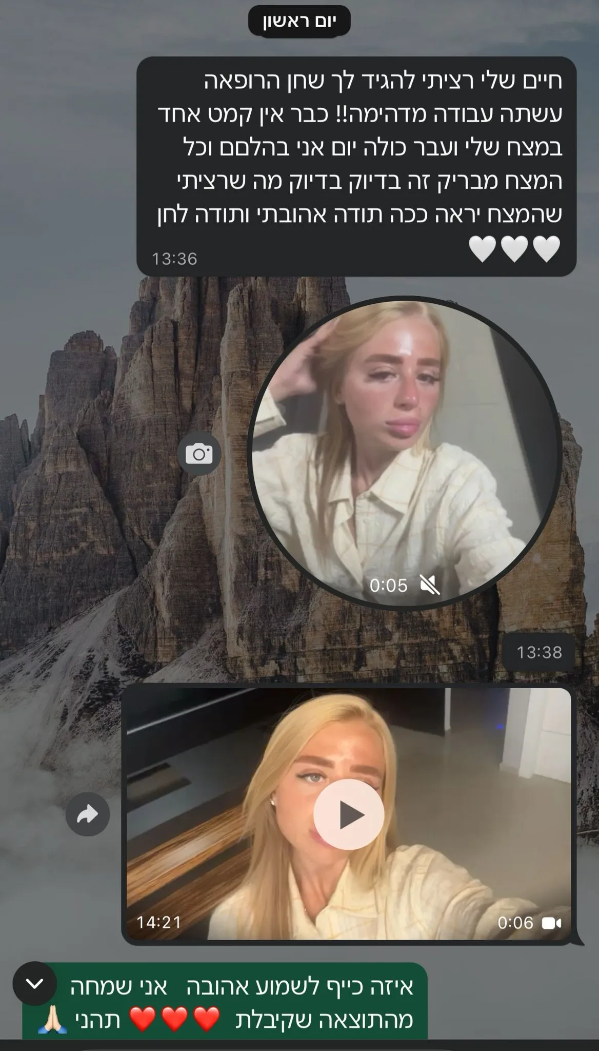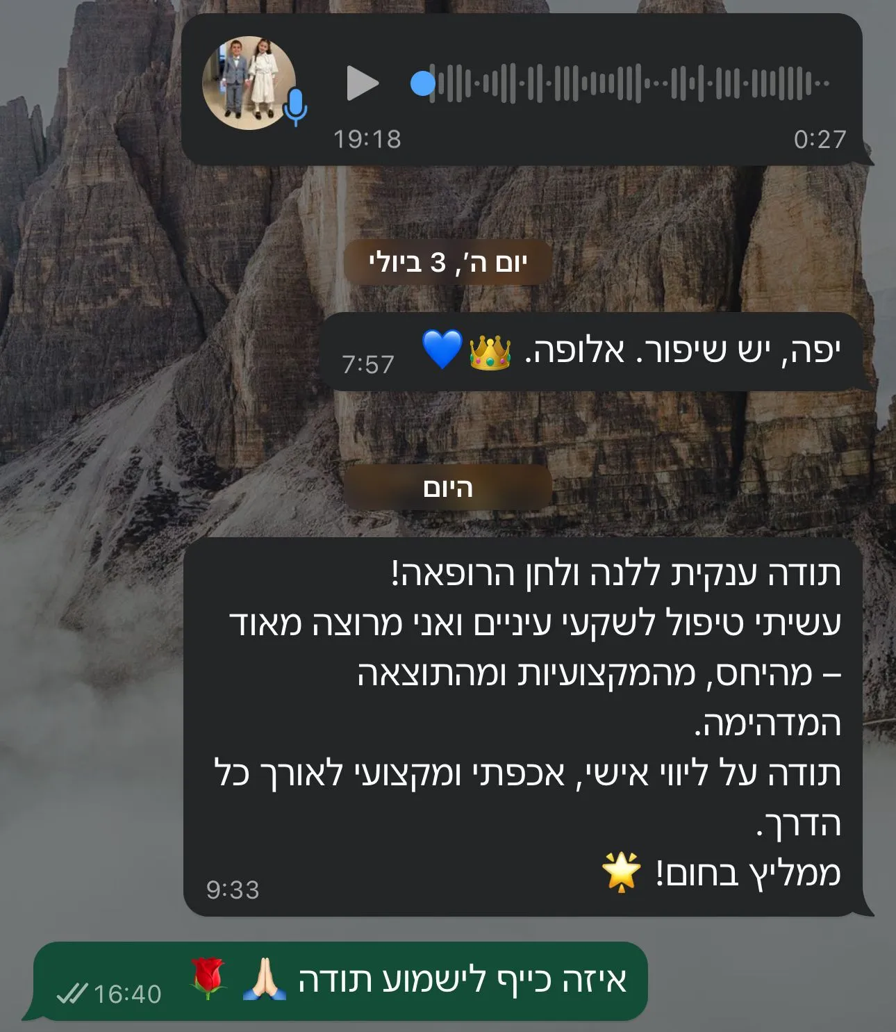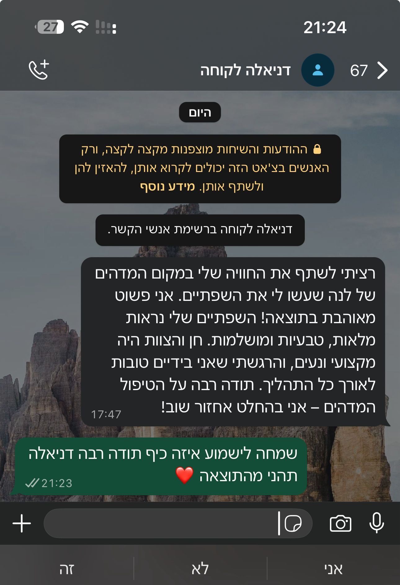 מעקב וביטחון: במידה ומופיעה תגובה שאינה מוכרת לך או שנמשכת מעבר למצופה, הצוות המקצועי זמין עבורך לייעוץ טלפוני או פגישת ביקורת, כדי להבטיח החלמה תקינה ושקט נפשי מלא.