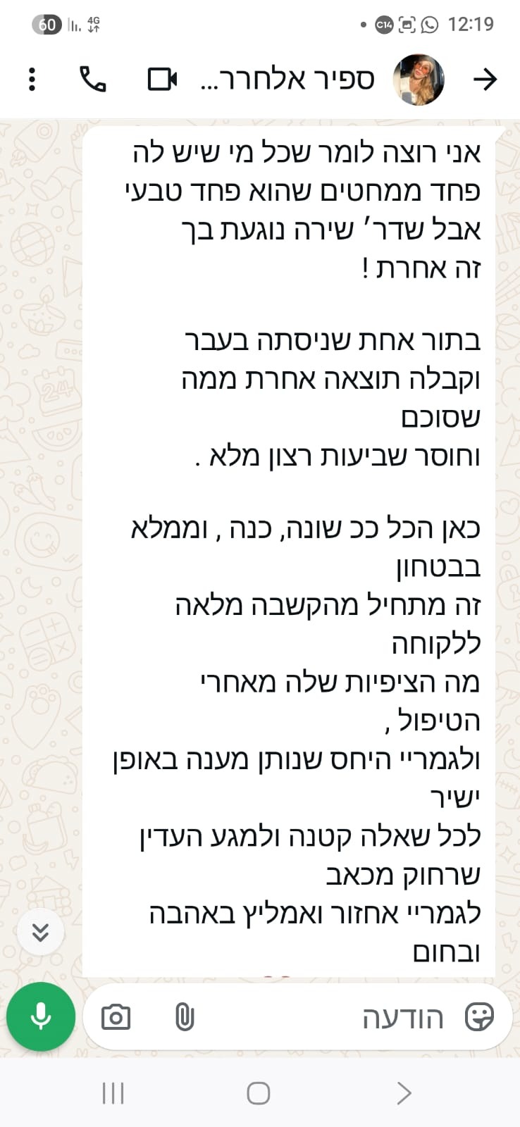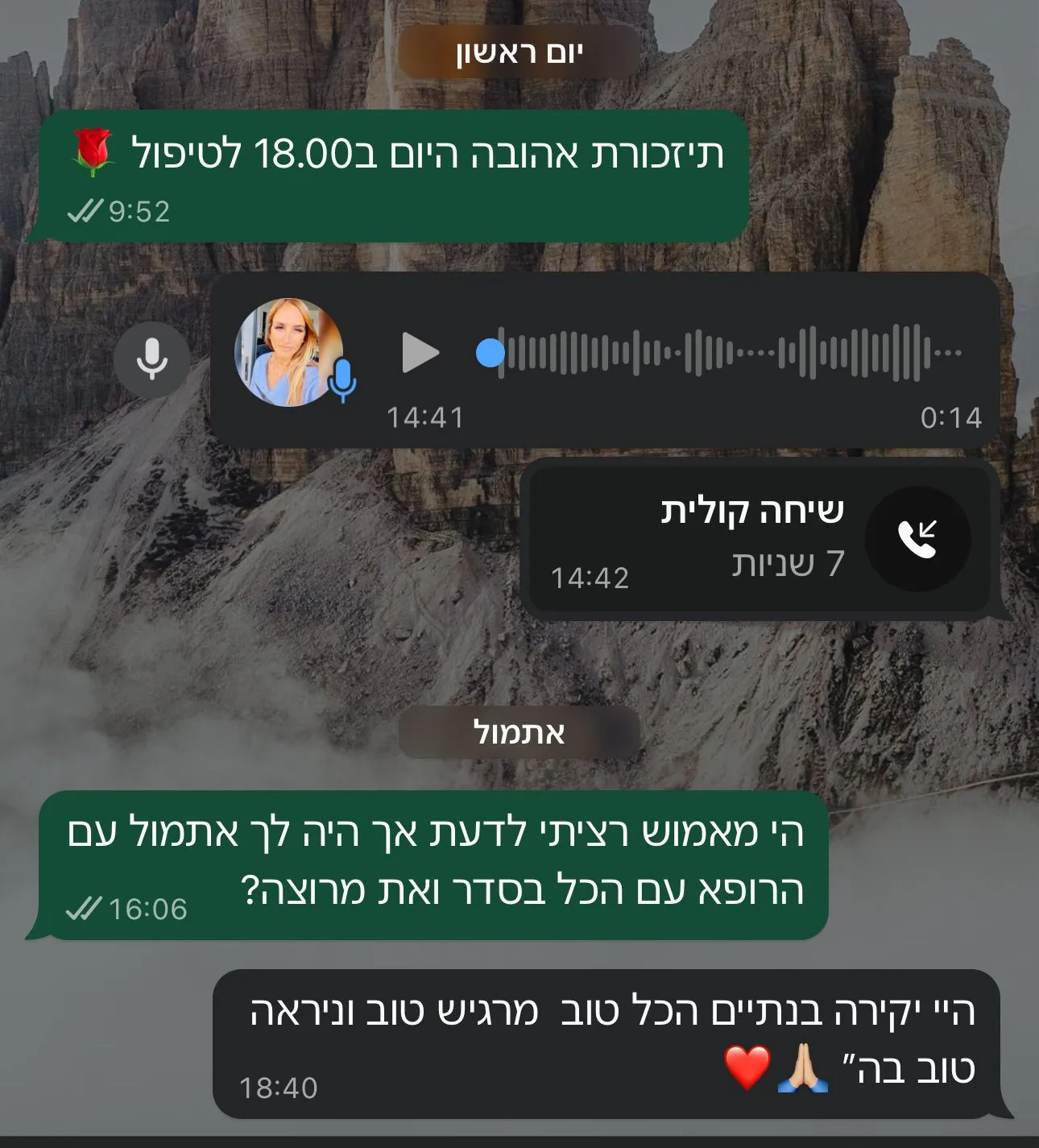 אני מחויבת לליווי אישי המושתת על יושרה מקצועית, מתן מענה לשאלות קליניות ואפשרות לקבלת החלטות מבוססות ידע בכל שלב בטיפול.