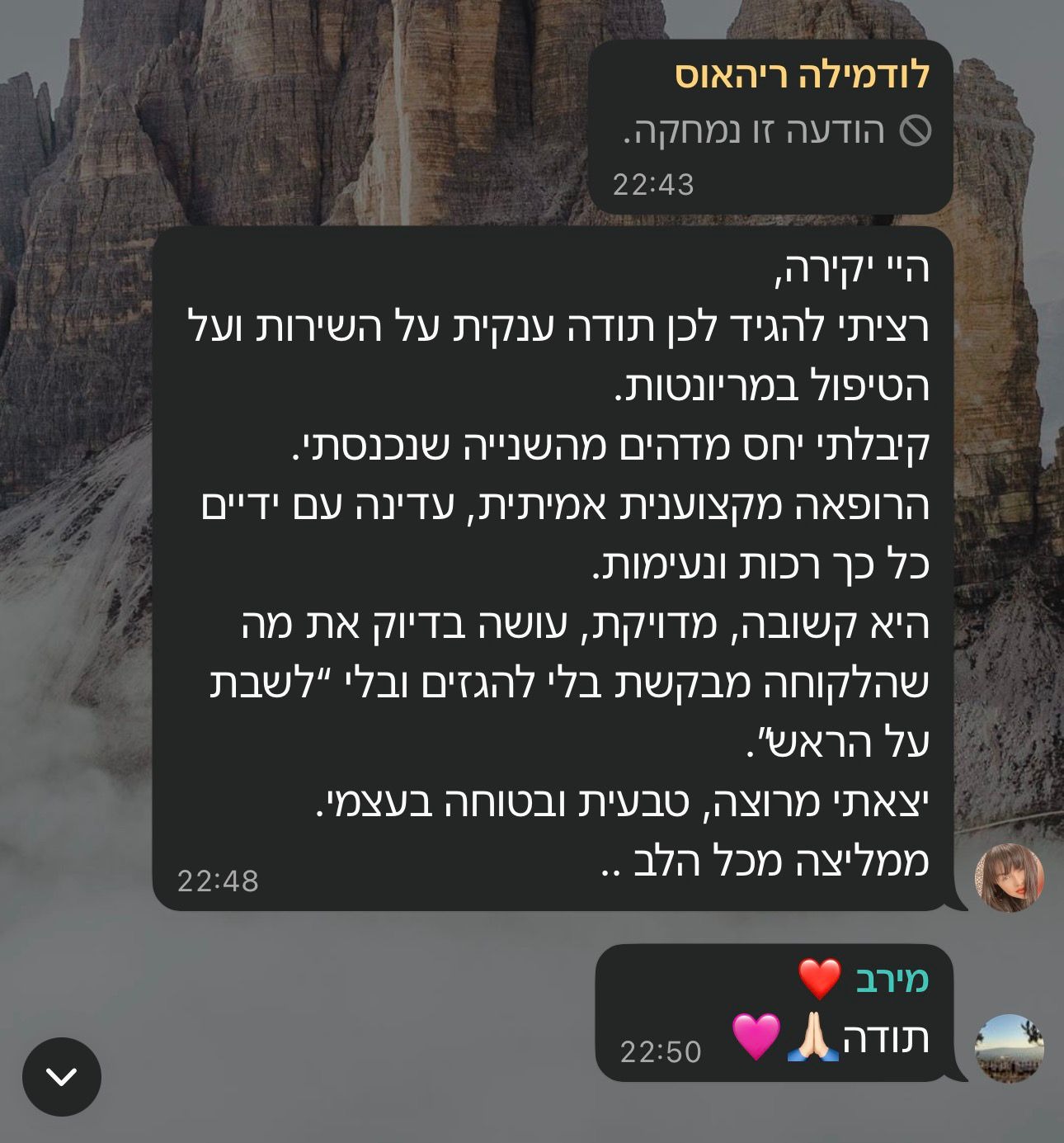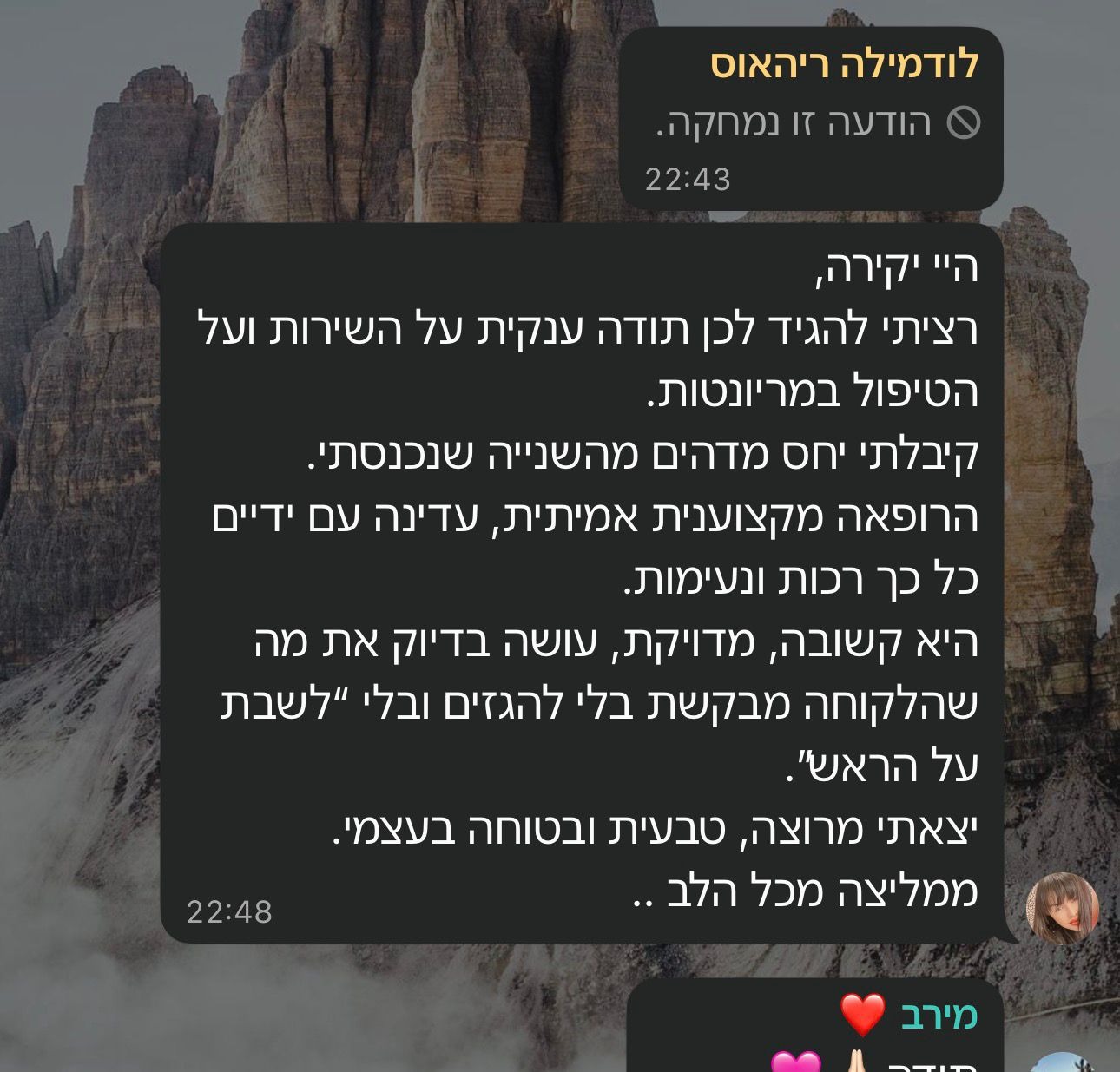 ליווי וזמינות: אנו מעניקות מעטפת ליווי מלאה לאחר הטיפול. במידה ומתעוררת שאלה או תחושה חריגה, הצוות המקצועי שלנו זמין עבורך למתן מענה מיידי והנחיות להמשך טיפול בבית.