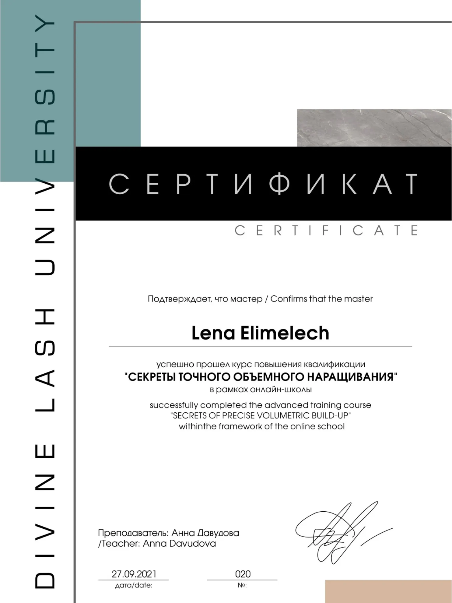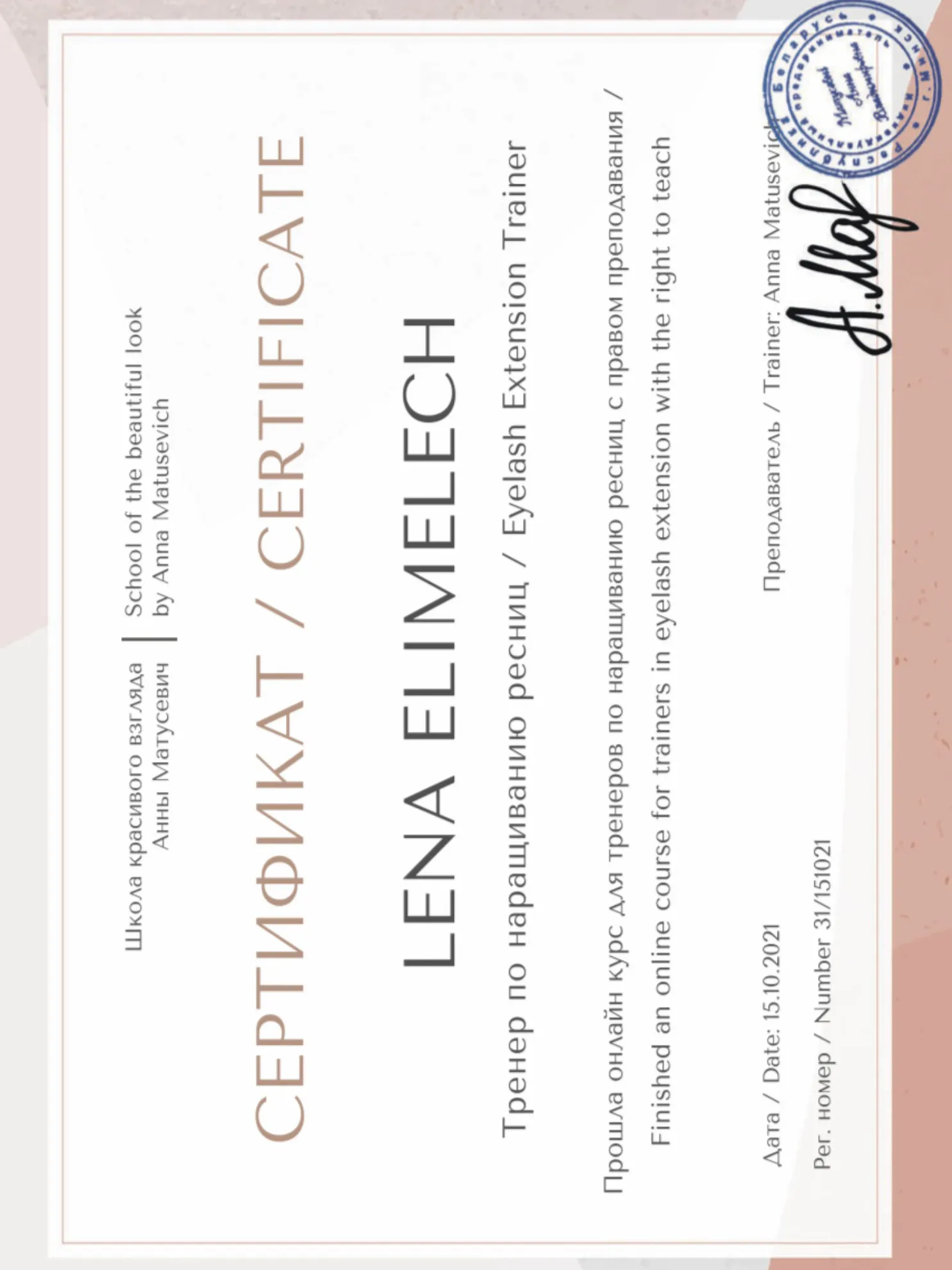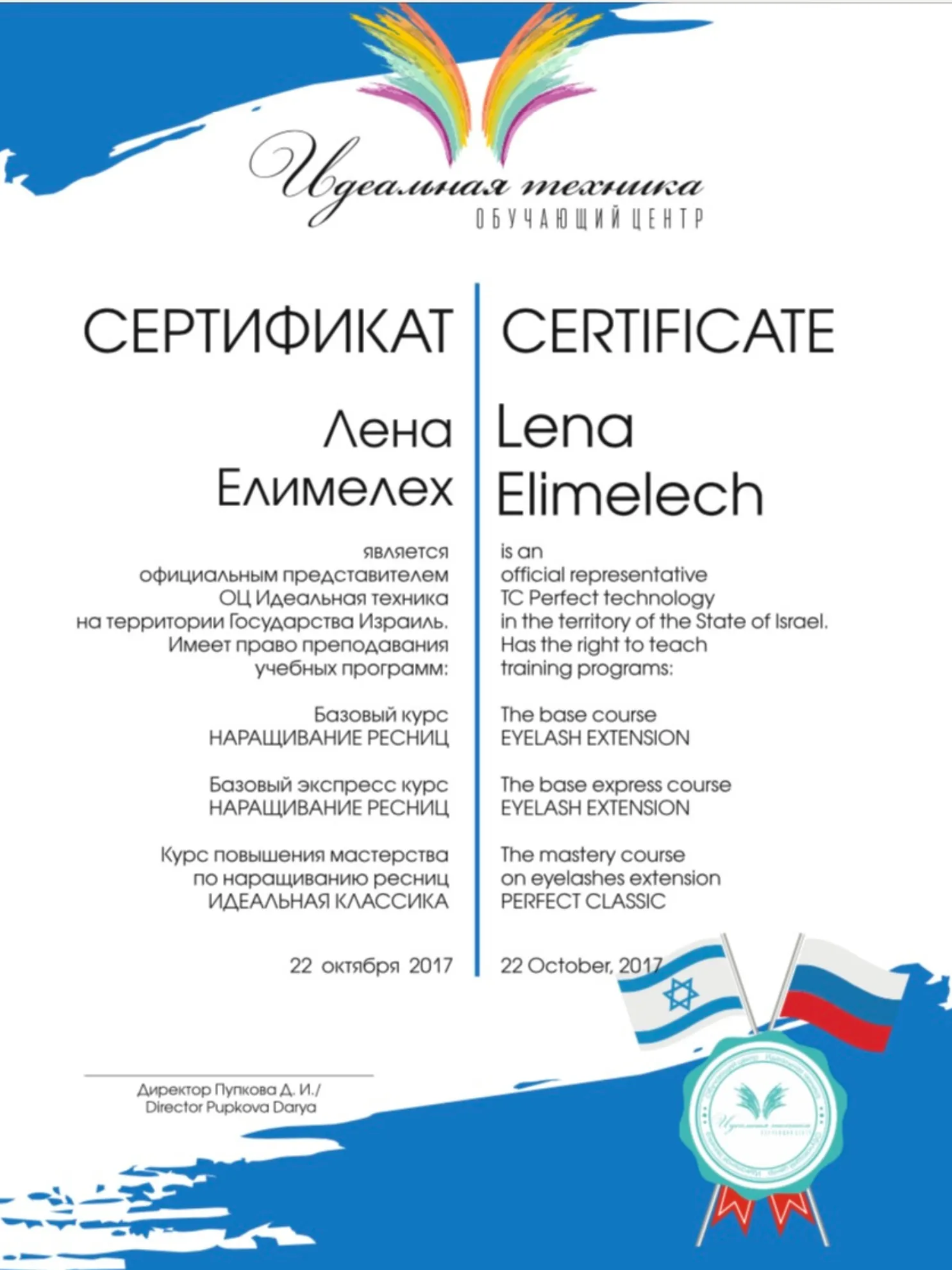 לנה היא מומחית בעלת שם ומורה מוסמכת להכשרות ביוטי, המובילה את תחום עיצוב הריסים בישראל עם ניסיון מעשי רב-שנים. המומחיות הייחודית שלה זיכתה אותה במקום השני בתחרות הארצית לעיצוב ריסים – הישג מקצועי המעיד על רמת דיוק ומיומנות יוצאת דופן. מעבר לעבודתה בקליניקה, לנה ביססה את מעמדה כאוטוריטה מקצועית דרך כתיבת ספר הדרכה מקצועי, המשמש כיום ככלי עזר חיוני עבור נשות מקצוע בתחילת דרכן ומעניק להן בסיס תיאורטי ופרקטי מוצק.